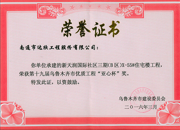 另訊,由我工程公司承建的新天潤國際社區(qū)三期(B區(qū))X-55#住宅樓工程,榮獲第十九屆烏魯木齊市優(yōu)質工程“亞心杯”獎。