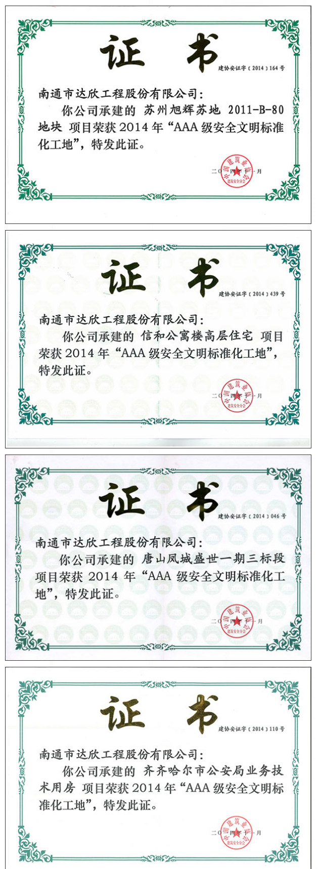 近幾年我公司獲得全國AAA級安全文明標(biāo)準(zhǔn)化工地16項(xiàng),創(chuàng)建面涉及上海、江蘇、湖南、河北、黑龍江、新疆等市場,安全文明施工管理水平再上新臺階,榮譽(yù)的取得為進(jìn)一步提升達(dá)欣品牌在全國各個市場的影響力,為進(jìn)一步提升企業(yè)形象、促進(jìn)企業(yè)長遠(yuǎn)發(fā)展奠定堅(jiān)實(shí)的品牌基礎(chǔ)。