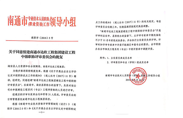 日前,根據(jù)《關(guān)于開展企業(yè)自主評(píng)價(jià)認(rèn)定中級(jí)職稱試點(diǎn)工作的通知》(通人社?!?017〕11號(hào))精神,南通市專業(yè)技術(shù)人員職稱(職業(yè))資格工作領(lǐng)導(dǎo)小組專題文件批復(fù),同意組建“南通市達(dá)欣工程集團(tuán)建設(shè)工程中級(jí)專業(yè)技術(shù)資格評(píng)審委員會(huì)”,達(dá)欣集團(tuán)由此獲得“中級(jí)職稱自主評(píng)價(jià)認(rèn)定資格”。