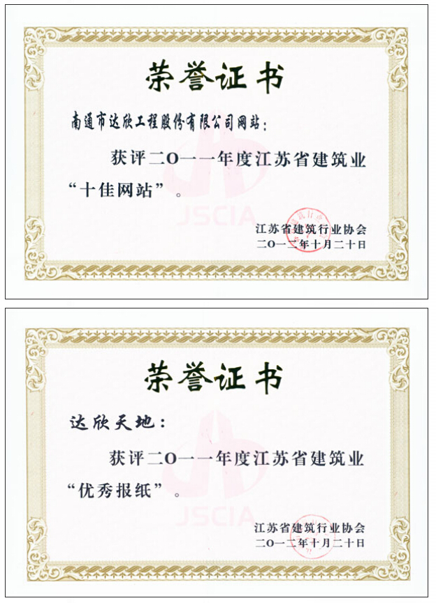 會議同時對2011年度江蘇省建筑業(yè)優(yōu)秀報、刊、網(wǎng)和優(yōu)秀通訊員進行了表彰,南通市達欣工程股份有限公司網(wǎng)站榮獲江蘇省建筑業(yè)“十佳網(wǎng)站”、“達欣天地”報榮獲江蘇省建筑業(yè)“優(yōu)秀報紙”。
