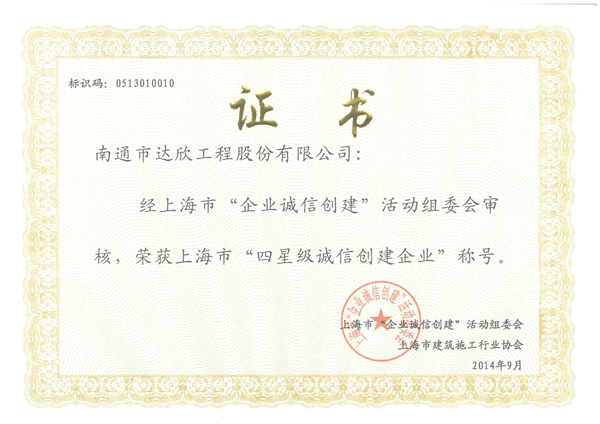 日前,由上海市建筑施工行業(yè)協(xié)會推薦,上海市“企業(yè)誠信創(chuàng)建”活動組委會審核,第三方征信機構(gòu)嚴(yán)格查證,第一工程公司在2013年榮獲“三星級誠信創(chuàng)建企業(yè)”后,今年再加一顆星,被授予上海市“四星級誠信創(chuàng)建企業(yè)”稱號。