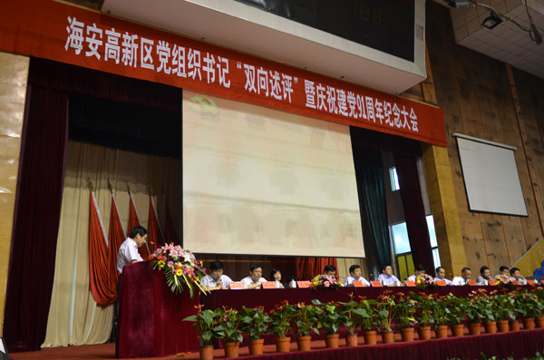 6月27日,海安高新區(qū)黨組織書記“雙向述評”暨慶祝建黨91周年大會在我縣海中體藝館舉行??h委常委、海安高新區(qū)黨工委書記張亞曦及全體黨政負責人、各局(辦)、各街、村(居)全體人員、各黨(總)支部書記、全體縣、鎮(zhèn)黨代表參加了會議。