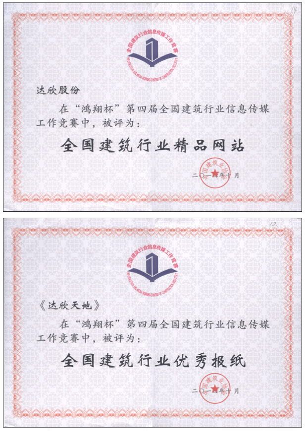 青海省建筑業(yè)協(xié)會(huì)副會(huì)長(zhǎng)兼秘書(shū)長(zhǎng)許光科致辭。中國(guó)建筑業(yè)協(xié)會(huì)副秘書(shū)長(zhǎng)趙峰講話(huà)。江蘇省建筑市場(chǎng)管理協(xié)會(huì)會(huì)長(zhǎng)汪士和、浙江省建筑行業(yè)協(xié)會(huì)副會(huì)長(zhǎng)吳漢忠等領(lǐng)導(dǎo)出席了會(huì)議。會(huì)上向“鴻翔杯”第四屆全國(guó)建筑行業(yè)信息傳媒工作競(jìng)賽的優(yōu)勝者頒發(fā)牌證?!斑_(dá)欣股份”企業(yè)網(wǎng)站榮獲全國(guó)建筑行業(yè)精品網(wǎng)站、 “達(dá)欣天地”企業(yè)報(bào)紙榮獲全國(guó)建筑行業(yè)優(yōu)秀報(bào)紙。