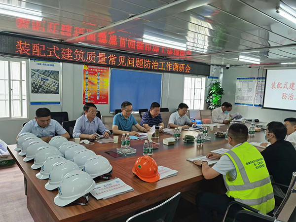 吳慧強(qiáng)從項(xiàng)目概況、前期準(zhǔn)備、常見問題和防治、現(xiàn)場不足五方面向領(lǐng)導(dǎo)們作了匯報(bào)。他表示,項(xiàng)目部將結(jié)合工程實(shí)際經(jīng)驗(yàn),積極為裝配式產(chǎn)業(yè)發(fā)展建言獻(xiàn)策。