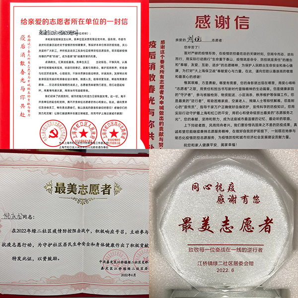 近日,公司陸續(xù)收到來(lái)自中共上海市虹口區(qū)四川北路街道工作委員會(huì)、街道辦事處、新冠疫情防控工作領(lǐng)導(dǎo)小組對(duì)集團(tuán)第一工程公司廣大職工、第八工程公司劉旭,以及中共嘉定區(qū)江橋鎮(zhèn)綠二社區(qū)對(duì)第八工程公司倪慶龍,在上海疫情期間,積極投身社區(qū)疫情防控志愿服務(wù),不懼風(fēng)雨、不辭辛苦,始終堅(jiān)守助力打贏上海疫情阻擊戰(zhàn)的基層戰(zhàn)場(chǎng),所展現(xiàn)出的大愛、擔(dān)當(dāng)、奉獻(xiàn)精神,表示感謝和慰問(wèn)。倪慶龍獲得“最美志愿者”稱號(hào)。