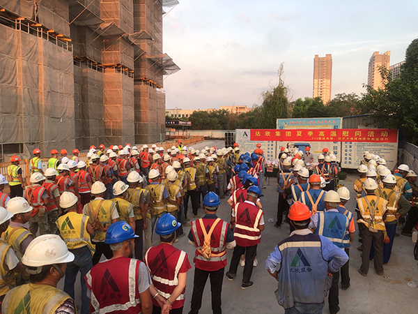 昆山花橋312國道南側(cè)商住用房工程項目現(xiàn)場,該標段的百多名工人在高溫下依舊在辛勤作業(yè),領(lǐng)導們?yōu)樗麄兯腿チ?/span>洗發(fā)水、風油精、毛巾、花露水、硫磺皂、洗衣粉等慰問品,同時囑咐項目部負責人一定要合理安排作業(yè)時間,多加注意員工的身體健康,特別是三高人群,全力做好預防工作和后勤保障工作,為廣大職工切實提供一個安全、優(yōu)良的生產(chǎn)環(huán)境。