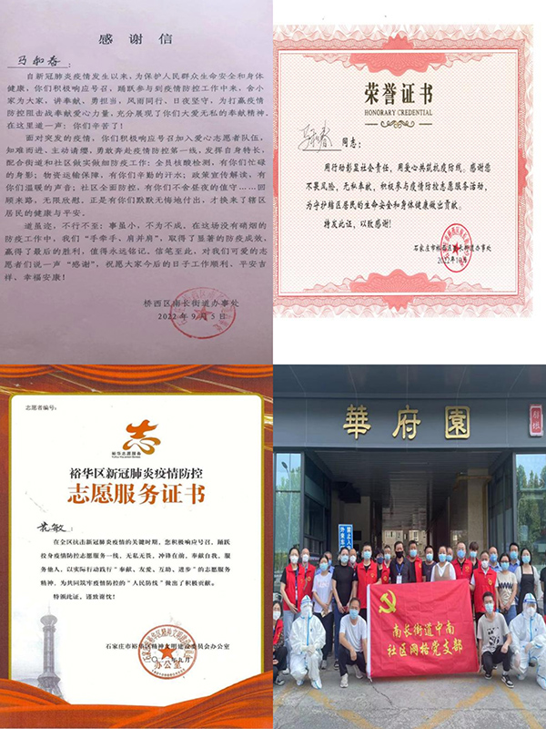 近日,第四工程公司陸續(xù)收到來自石家莊橋區(qū)西區(qū)南長(zhǎng)街道辦事處、裕華區(qū)精神文明建設(shè)委員會(huì)對(duì)馬和春、花敏等同志的感謝信,對(duì)他們?cè)谑仪f市疫情期間,主動(dòng)請(qǐng)纓加入志愿者隊(duì)伍,不懼風(fēng)險(xiǎn)、知難而進(jìn),為社區(qū)物資配送、核酸檢測(cè)、信息統(tǒng)計(jì)、環(huán)境消殺、防控措施宣傳等方面所做的貢獻(xiàn)和展現(xiàn)出的舍小家為大家的無私、擔(dān)當(dāng)、奉獻(xiàn)精神表示感謝。