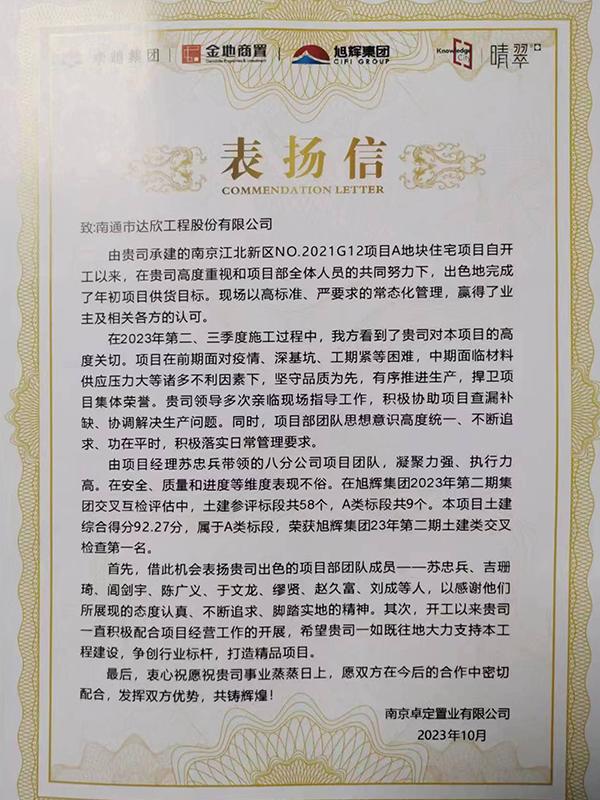 近日,公司收到南京卓定置業(yè)有限公司發(fā)來的表揚信,對公司南京G12項目管理團隊出色完成年初項目預(yù)期目標,以及在項目建設(shè)中表現(xiàn)出的專業(yè)、認真、負責的態(tài)度,不畏困難、迎難而上的精神,高標準、嚴要求的工作作風提出贊揚和認可。此外,該項目旭輝集團2023年第二期土建類檢查榮獲第一名的好成績。