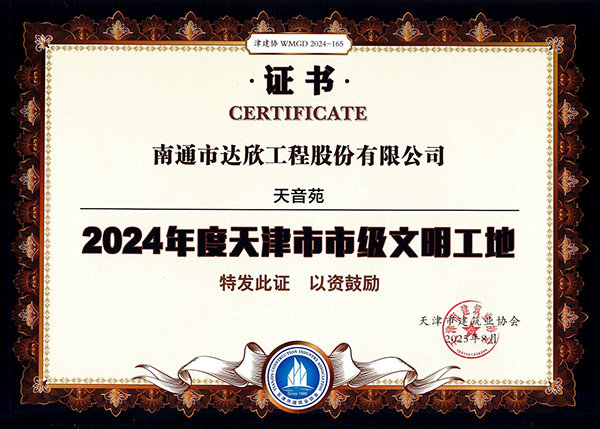 近日,天津市建筑業(yè)協(xié)會發(fā)布了津建協(xié)〔2025〕9號關于公布2024年度天津市文明施工示范工地和天津市市級文明工地通過工程的名單,第六工程公司承建的天音苑項目被授予“2024年度天津市市級文明工地”稱號。