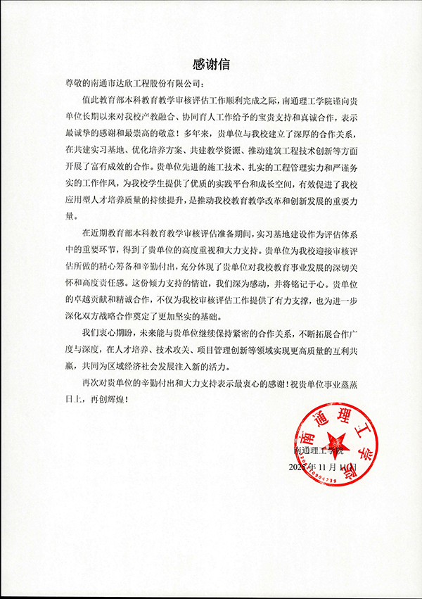 集團近日收到南通理工學院的感謝信,對其在本科教育教學審核評估中的大力支持表示誠摯感謝。