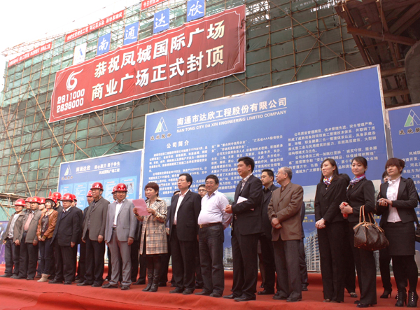在4月15日的裙樓封頂儀式上,唐山天壤房地產(chǎn)開發(fā)有限公司闞春鳳董事長首先向全體參建人員表示衷心的感謝,對達欣公司在工程建設(shè)中所做的努力給予高度評價和充分肯定,她在最后致詞中堅信:在達欣股份等諸多品牌公司的通力協(xié)作之下,在全體參建人員的共同努力下,鳳城國際廣場項目一定會如期完成。