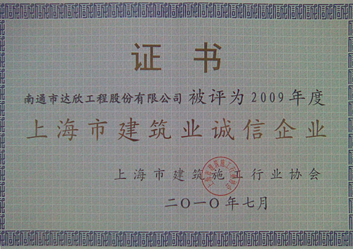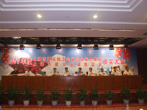 2010年7月30日,2009年度上海市建筑施工企業(yè)綜合實(shí)力及上海市建筑業(yè)誠(chéng)信企業(yè)頒獎(jiǎng)大會(huì)在青松城會(huì)議中心召開(kāi)。出席會(huì)議的有上海市建委、上海市建管辦、市場(chǎng)管理總站、施工行業(yè)協(xié)會(huì)、各省滬辦領(lǐng)導(dǎo)以及獲獎(jiǎng)企業(yè)共四百多人參加。