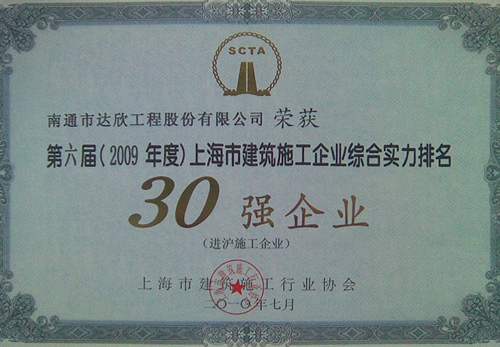 達(dá)欣股份榮獲上海市建筑施工企業(yè)綜合實(shí)力30強(qiáng)企業(yè)稱號(hào)