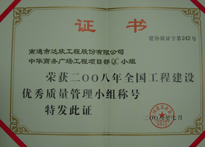 2008年7月6日,由中國(guó)建筑業(yè)協(xié)會(huì)組織的2008年度全國(guó)工程建設(shè)優(yōu)秀質(zhì)量管理(QC)小組活動(dòng)成果發(fā)布會(huì)在廣西桂林落下帷幕,我公司中華商務(wù)廣場(chǎng)工程項(xiàng)目部QC小組作為河北省推薦的十二個(gè)省級(jí)QC小組之一參加了會(huì)議并榮獲全國(guó)工程建設(shè)優(yōu)秀QC小組。這是我公司以“達(dá)欣”品牌獲得的第一項(xiàng)國(guó)家級(jí) QC成果獎(jiǎng)。