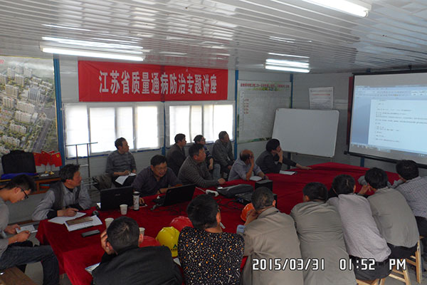 第九工程公司技術(shù)負(fù)責(zé)人楊本榮進(jìn)行了主講。培訓(xùn)重點(diǎn)圍繞《江蘇省質(zhì)量通病防治》手冊,圖文并茂的講解,使大家對工程中存在的質(zhì)量通病的防治有了進(jìn)一步的了解和認(rèn)識,同時(shí)針對祥河灣項(xiàng)目檢查存在的質(zhì)量問題,楊本榮同志還進(jìn)行了耐心細(xì)致的原因分析及拿出了解決方案。